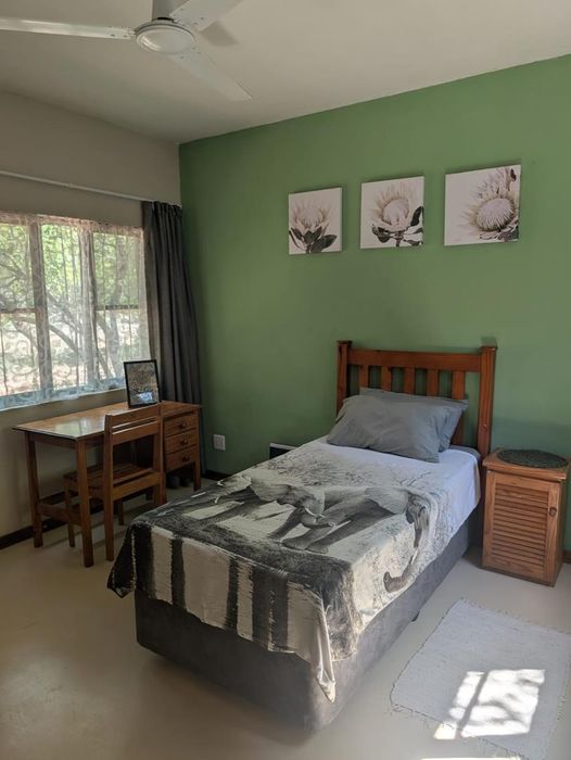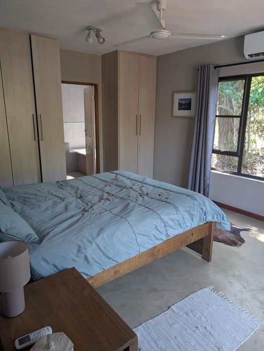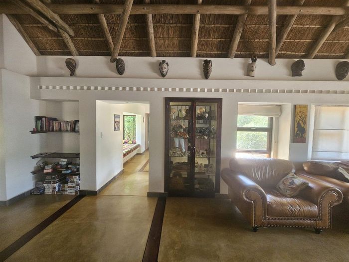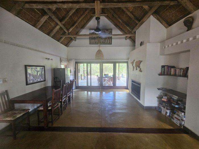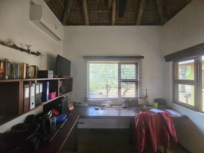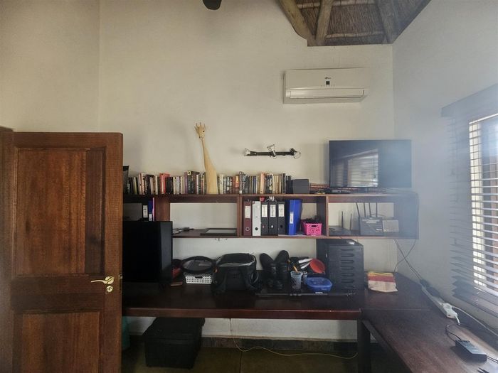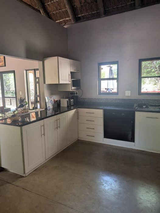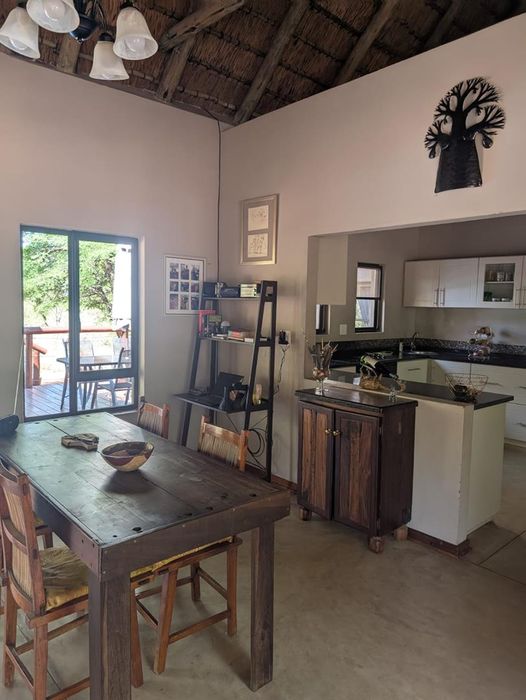 Live bushveld life in Raptors View Wildlife Estate, entertaining on a thatch-covered patio with built-in braai, pool and outdoor boma. Three bedrooms, two baths; furnished and secure.